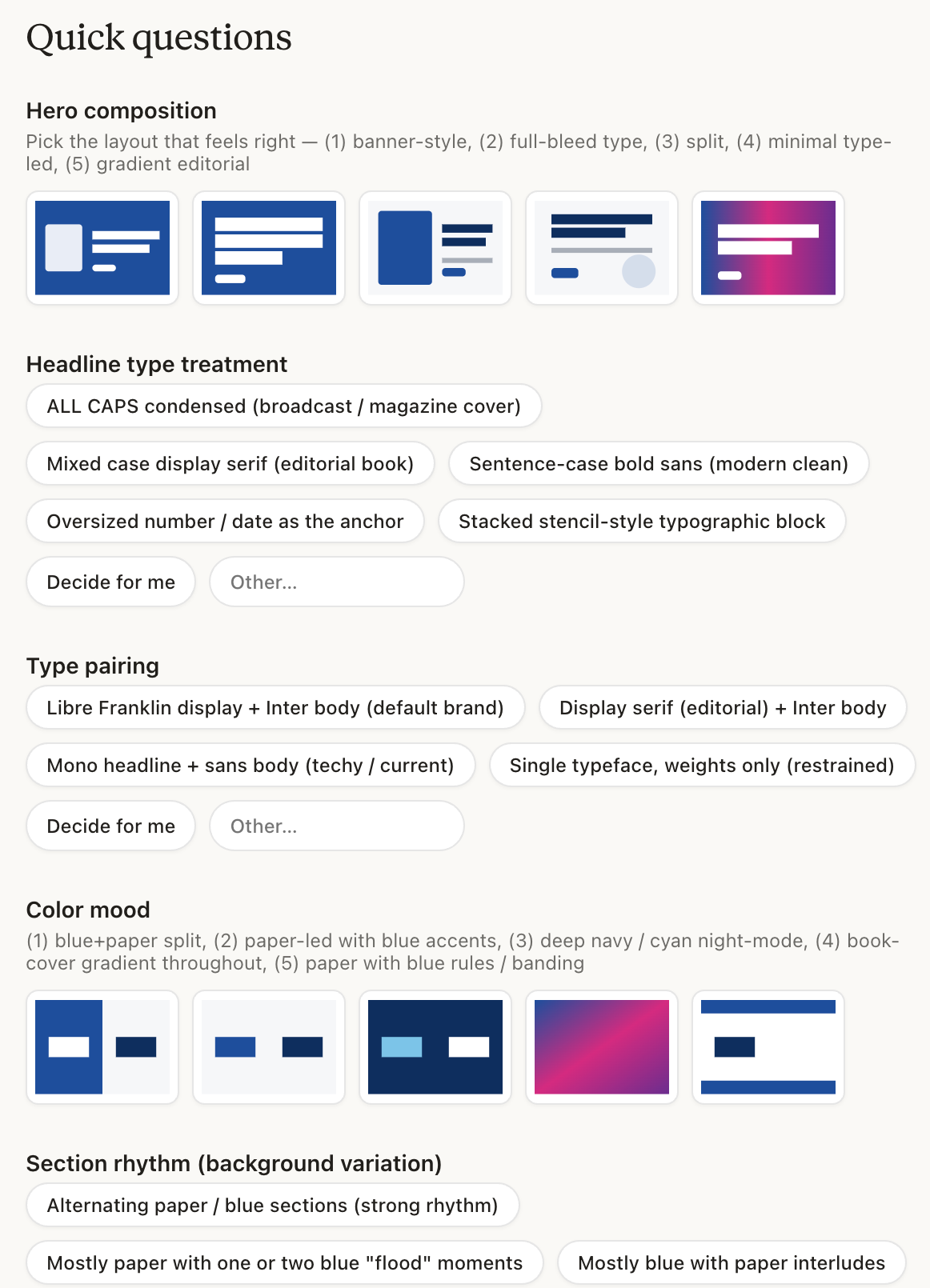 If you start from absolutely nothing, the experience changes. Claude does its best, walks you through smart questions (see screenshot below for landing page example) about audience and tone, and you can hand the design decisions over entirely if you want. The output is competent. But hitting exactly what you imagined takes more iteration, more re-prompting, and more taste calls from you.