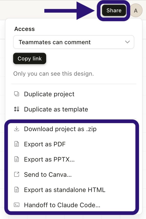 Export to Canva, PowerPoint, PDF, standalone HTML, or hand off directly to Claude Code.