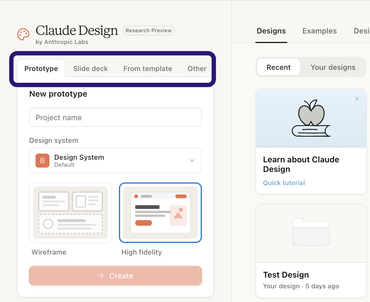 Open claude.ai/design. You see four entry points at the top of the workspace: