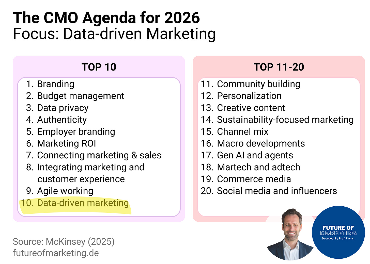 Branding (#1)? Requires data to measure distinctiveness, track perception, and allocate budgets. Marketing ROI (#6)? Impossible without clean, shared data. Connecting marketing and sales (#7)? A coordination problem that collapses without a common data foundation. Personalization (#12)? Entirely data-dependent.