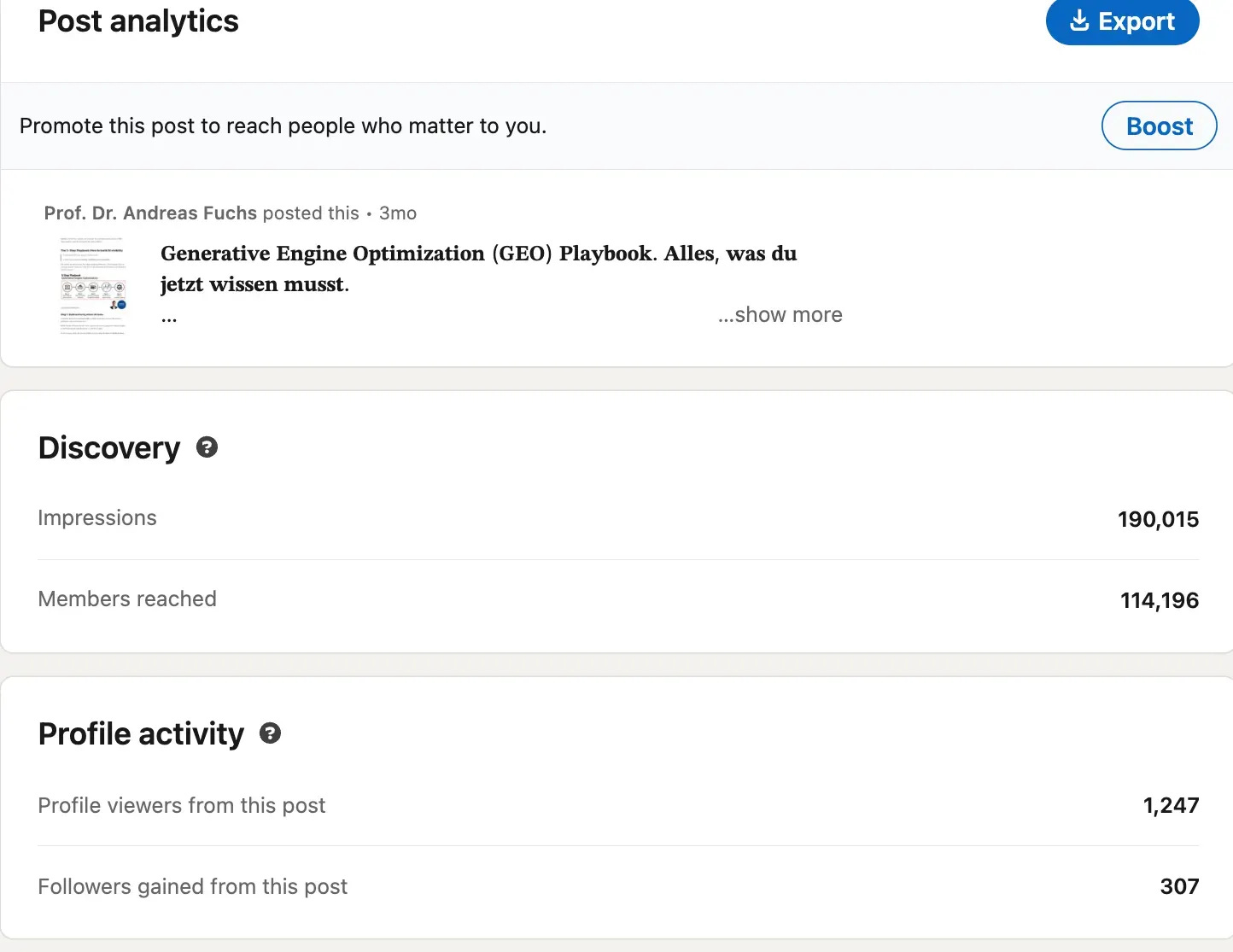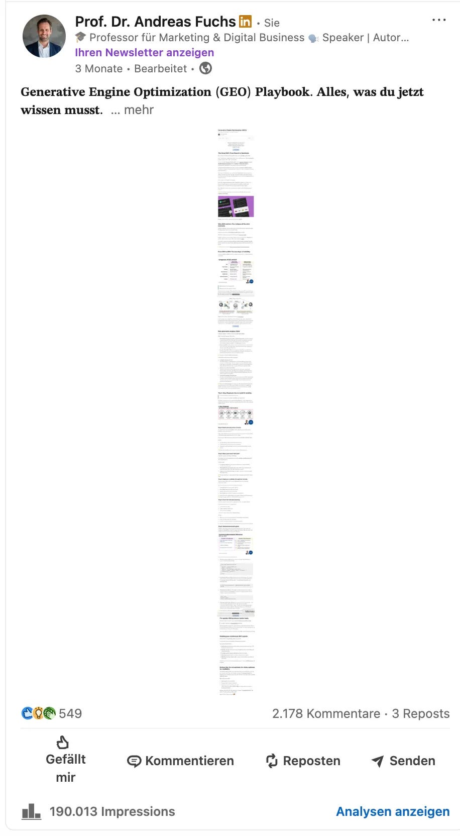 In November 2025, I published a post about my Generative Engine Optimization (GEO) Playbook. The post generated over 190,000 impressions, more than 2,100 comments, 549 reactions, and 307 new followers — from a single post.