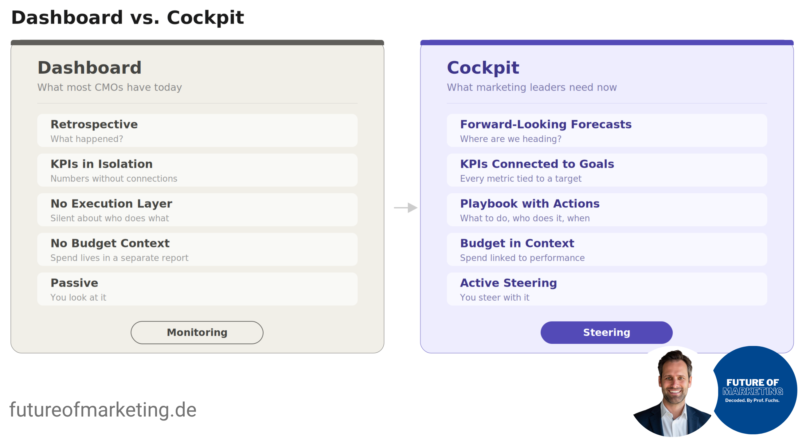 Dashboards were built for an era when the primary challenge was visibility. That era is over. What marketing leaders need now is a system that connects numbers to actions, actions to owners, and owners to outcomes.