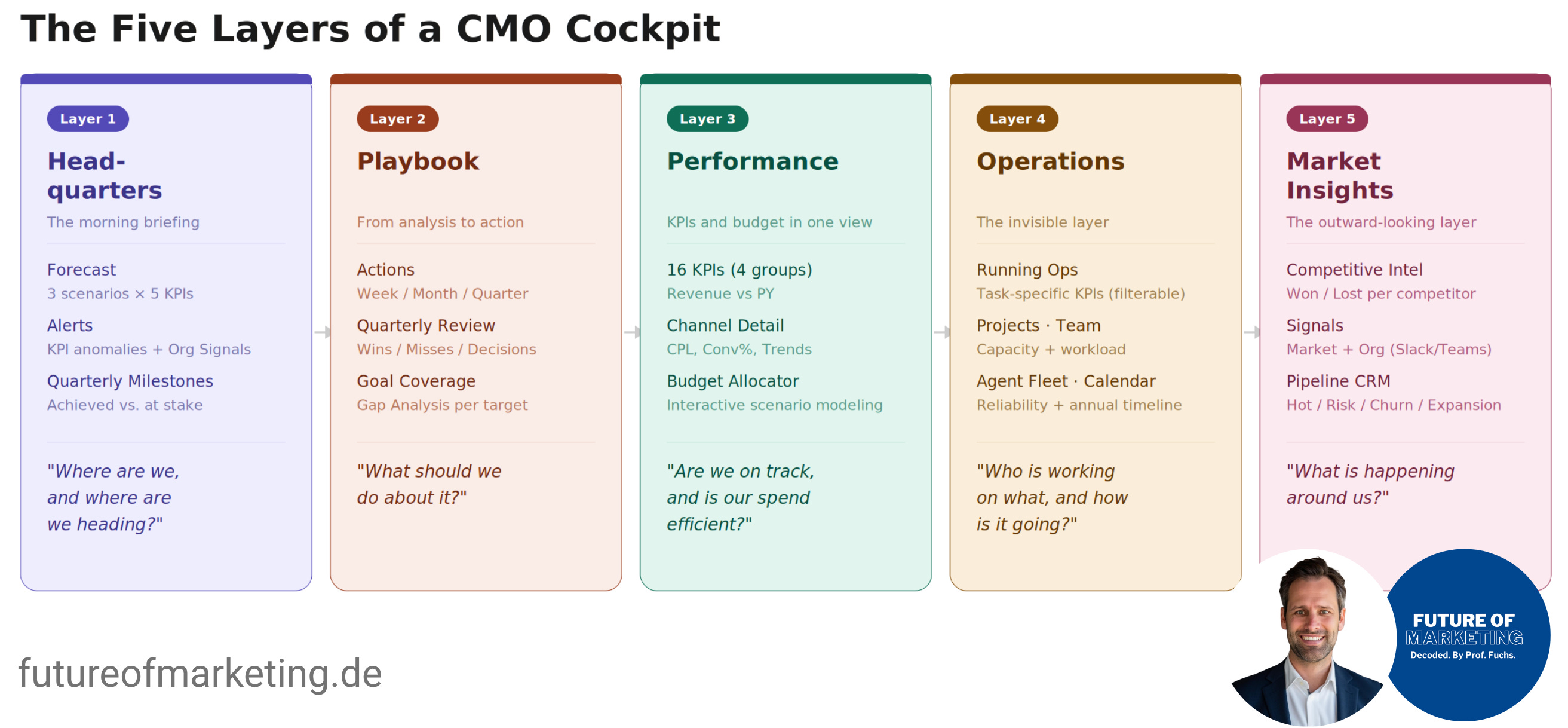 A CMO Cockpit follows the same logic. It brings five layers together into one decision environment: